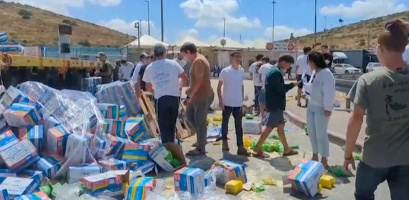 Sejumlah warga Israel menggelar protes dengan merusak dan menginjak-injak berbagai bantuan kemanusiaan untuk warga Palestina di Jalur Gaza
