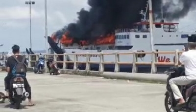 Bengkalis, Satuju.com - Kapal Motor Penyebrangan (KMP) Permata Lestari I, terbakar di Pelabuhan Pelabuhan Kargo Air Putih atau yang lebih dikenal Pelabuhan BUMD, Jalan Panglima Minal, Gg. Syahbandar II, Desa Air Putih Kecamatan Bengkalis, Kamis, 23 Mei 2024.