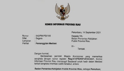 Untuk diketahui surat pangilan mediasi yang dikirim panitera PPID Rini Fitriyani kepada BPKP Berdasarkan perintah Majelis Komisioner yang memeriksa sengketa dengan nomor register. Reg.011/PSI/KIP-R/VI/2021, Komisi Informasi Provinsi Riau memanggil para pihak untuk hadir dalam Mediasi terkait sengketa informasi publik antara: Badan Pemantau Kebijakan Publik Provinsi Riau, sebagai Pemohon; Terhadap Atasan PPID Utama Pemerintah Kota Pekanbaru, sebagai Termohon. yang diselenggarakan pada hari Jum'at. (17 September 2021) di Kantor Komisi Informasi Provinsi Riau l JI. Gajah Mada No. 200 Lt. IlI Gedung KONI Provinsi Riau pukul 09.00 WIB.**