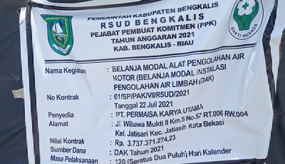 Proyek RSUD Kab Bengkalis dari DAK (Dana Alokasi Khusus) TA 2021. Dengan no kontrak 01/SP/PAK/VII/RSUD/2021, tanggal 22 Juli 2021, Belanja modal alat pengolahan air kotor (Belanja modal instalasi pengolahan Air limbah DAK), Dengan anggaran Rp3.737.371.274.23,- Milyar.
