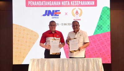 JAKARTA, Satuju.com - JNE Express dan Komite Olahraga Nasional Indonesia (KONI) menandatangani Nota Kesepahaman (Memorandum of Understanding/MoU) mengenai pemanfaatan jasa layanan logistik dalam rangka pengembangan olahraga nasional. Penandatanganan dilakukan oleh Mohamad Feriadi Soeprapto selaku Presiden Direktur JNE dan Let. Jend TNI (Purn) Marciano Norman selaku Ketua Umum KONI disaksikan oleh jajaran JNE dan KONI yang dilaksanakan pada Rabu (12/6/2024) di Kantor Pusat JNE, Jl. Tomang Raya 11, Jakarta Barat.