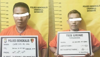 Bengkalis, Satuju.com - Dua tersangka pengedar narkotika jenis sabu di Desa Muntai, Kecamatan Bantan Bengkalis berhasil diamankan Tim Opsnal Sat Res Narkoba Polres Bengkalis pada Sabtu (8/6/2024).