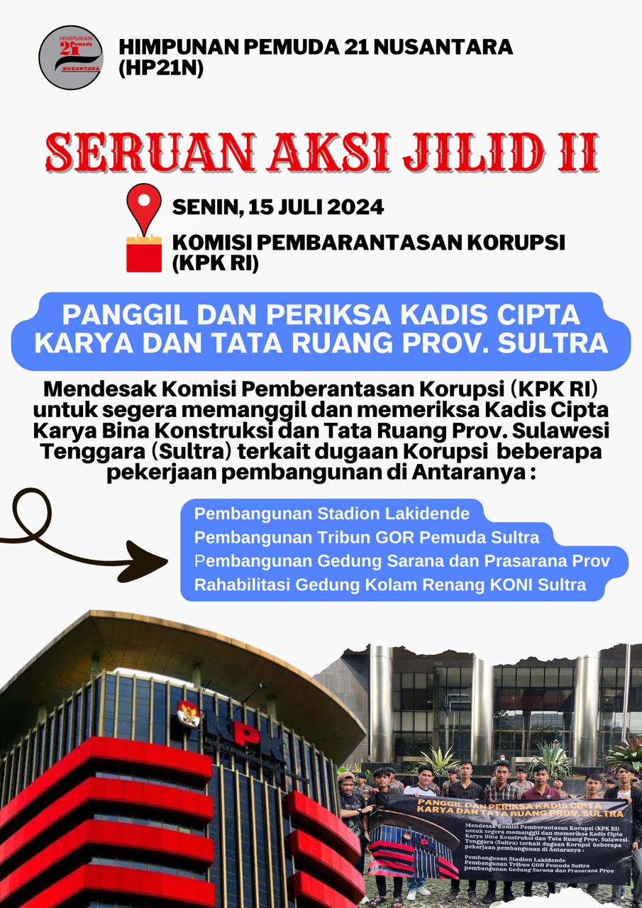 "HP21N meminta kepada KPK RI untuk memanggil dan memeriksa Kepala Dinas Cipta karya dan Bina Kontruksi dan Tata Ruang provinsi Sulawesi Tenggara (Sultra) terkait proyek pembangunan stadion lakidende, Proyek pembangunan tribun GOR pemuda Sultra dan Proyek Pembangunan Sarana - Prasarana Pemprov Sultra," ungkapnya.