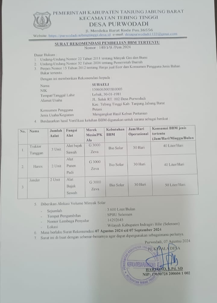 Ket. Poto: Surat Rekomendasi Pembelian BBM Tertentu. Masa berlaku surat rekomendasi 07 Agustus 2024 s/d 07 September 2024. Dengan kapasitas dan waktu yg d tentukan oleh WEB. MYPERTAMINA SUBSIDI TEPAT.