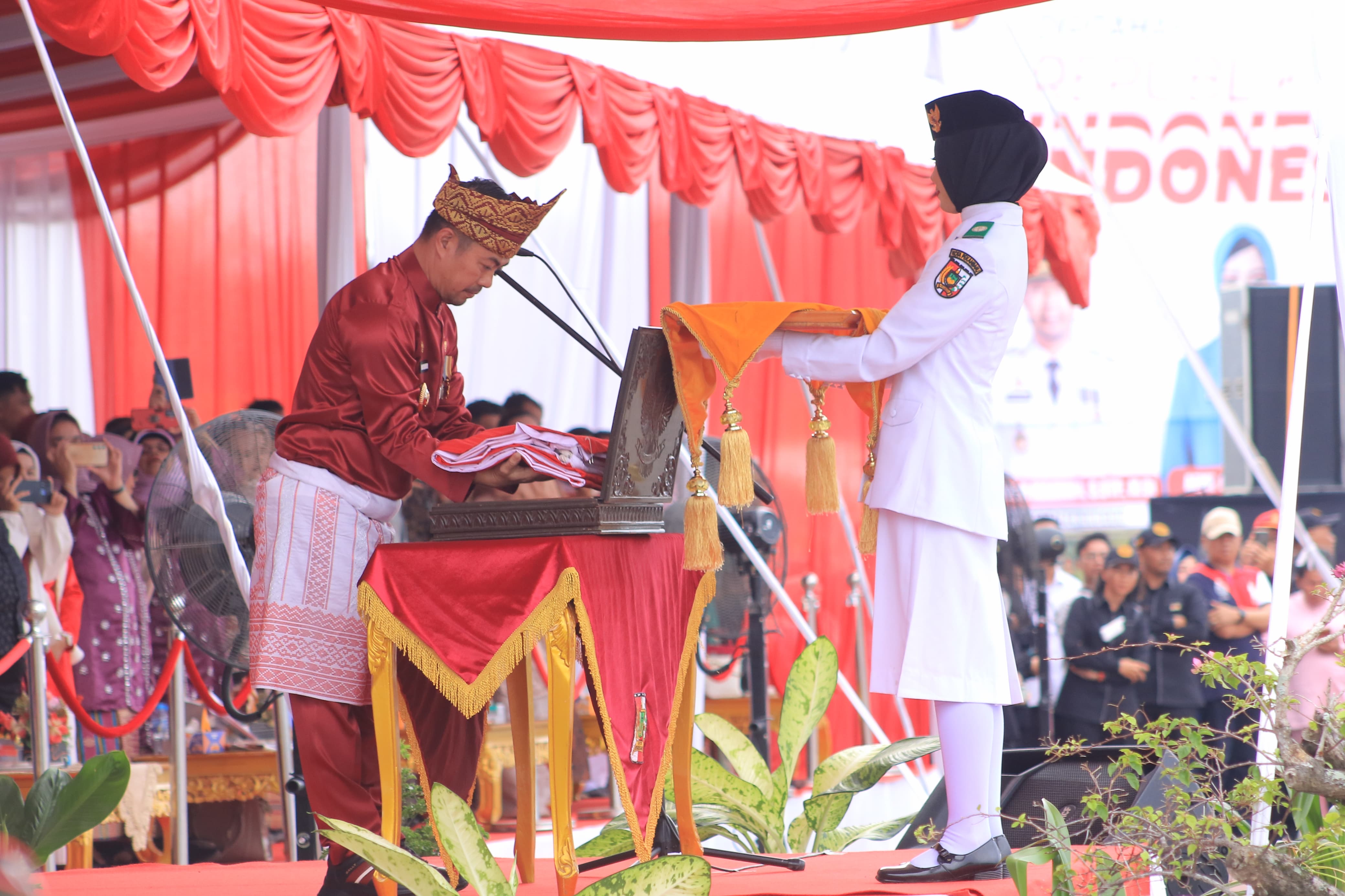 “Alhamdulillah upacara penurunan duplikat bendera pusaka merah putih pada HUT RI Ke-79 berjalan lancar, dan khidmat,” ujar Risnandar Mahiwa.