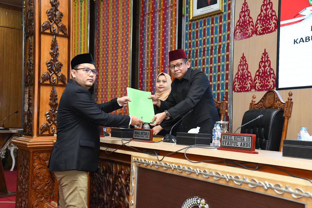 Usai mendengarkan pandangan umum, dilanjutkan dengan penyerahan naskah dari masing-masing fraksi kepada Pimpinan DPRD, Sofyan.