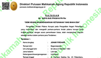 PEKANBARU, Satuju.com - Berdasarkan surat putusan hakim Tipikor pada Pengadilan Negeri Pekanbaru, Nomor: 62/PID.SUS.TPK/2016/PN Pbr tanggal 23 Februari 2017 yang diterima Redaksi Harian Berantas dan LSM Antikorupsi di Pekanbaru, Rabu (06/10/2021) sore kemaren, ternyata dalam putusan Majelis Hakim Tindak Pidana Korupsi (Tipikor) pada Pengadilan Negeri Pekanbaru tersebut, ada sejumlah nama yang terungkap turut menerima aliran uang Suap APBD Riau tahun 2014 dan rancangan APBD Riau 2015 menjadi APBD Perubahan 2014 yang telah menjerat mantan Ketua DPRD Riau Johar Firdaus bersama Suparman masuk penjara.