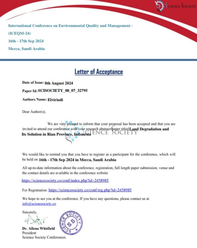 “Alhamdulillah, makalah saya yang berjudul : “Degradasi Lahan dan Solusinya Di Provinsi Riau, Indonesia” diterima seminar Reviewer. Saya ingin nama Riau harum di pentas dunia,” ucapnya semangat, Rabu (21/8/24).