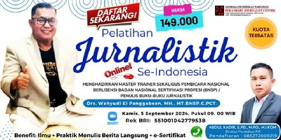 Ikuti saja Pelatihan Jurnalistik secara Zoom-OnLine, pada Pukul: 09.00 WIB - 12.00 WIB, Kamis, 5 September 2024.
