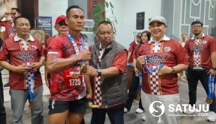 Malang, Satuju.com - Ketua Umum PWI Pusat, Zulmansyah Sekedang dan Wakapolresta Malang Kota AKBP Adhitya Panji Anom, menyambut kedatangan para pelari Siwo PWI Malang Raya Night Run yang ditandai dengan pengalungan medali di halaman gedung DPRD Kota Malang, Sabtu malam (7/9 /2024).