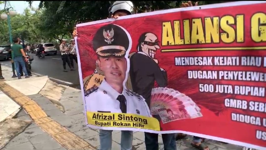 “Kami mendesak Kejati Riau segera menangkap Bupati Afrizal Sintong yang diduga kuat terlibat dalam penyelewengan dana PI dan DBH Kelapa Sawit. Dana sebesar itu diduga telah digunakan untuk kepentingan pribadi, termasuk untuk memasukkan kampanye Pileg anak kandung dan adik kandungnya, serta Pilkada kepala daerah,” tegas Erlangga di tengah riuhnya suara massa aksi.