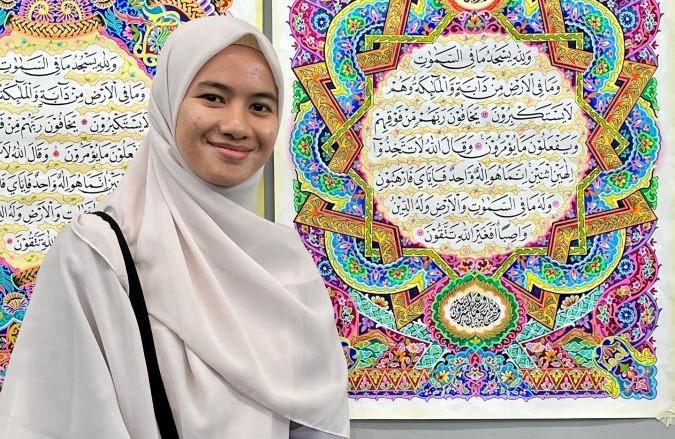 Mahasiswi STIE Syariah Bengkalis Nesa Aqila, putri dari Kateni dan Kartini dari desa Kembung Luar Kecamatan Bantan menunjukkan keahlian luar biasa dalam seni kaligrafi Islam.