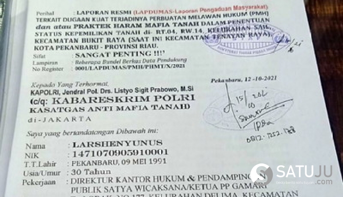 Guna menindaklanjuti Keluh Kesah dan Penderitaan Tokoh Masyarakat Riau tersebut, hari ini, Jum'at (15/10/2021) secara tegas Laporan Resmi disampaikan kepada Bapak Kapolri, Jenderal Polisi Drs Listyo Sigit Prabowo M.Si.