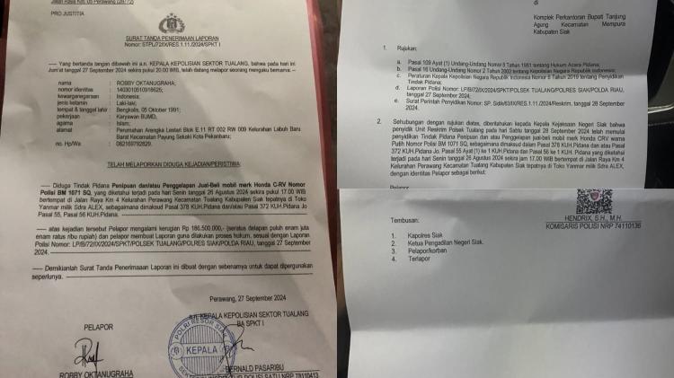 Pekanbaru, Satuju.com - Perkara Kasus dugaan tindak pidana penipuan dan/atau penggelapan Jual-beli mobil merk Honda CRV Nomor Polisi BM 1071 SQ diketahui terjadi di jalan raya KM 4 kelurahan Perawang kecamatan Tualang kabupaten Siak tepatnya di toko Yanmar milik Sdra AX pada hari Senin (26/8/2024) lalu sekira pukul 17.00 WIB.