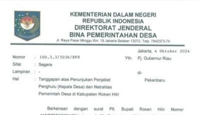 Hal itu tertuang dalam Peraturan terbaru pertanggal 4 (empat) Oktober 2024 bersifat Segera yang di keluarkan oleh Kementrian Dalam Negeri Republik Indonesia Direktorat Jendral Bina Pemerintahan Desa yang ditandatangani oleh Dirjen BPD ditujukan kepada Pj Gubernur Riau Nomor 100.3.3/5036/BPD yaitu tentang Tanggapan atas penunjukkan penjabat Penghulu (Kepala Desa) dan netralitas Pemerintah Desa di Kabupaten Rokan Hilir.