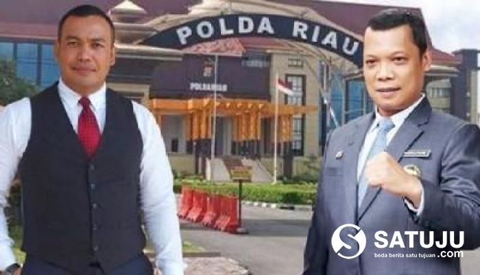 Kuasa hukum MS, DR (c) Dedek Gunawan, SH. MH, Muflihun (kanan), background kantor Polda Riau.
