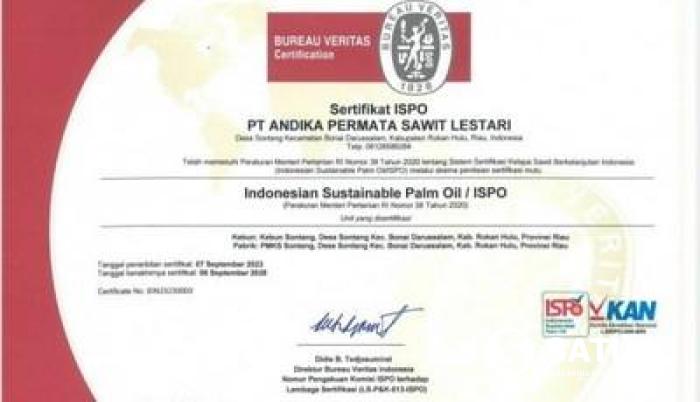 Sertifikat ISPO, PT Andika Permata Sawit Lestari (PT APSL). (Poto/ist)