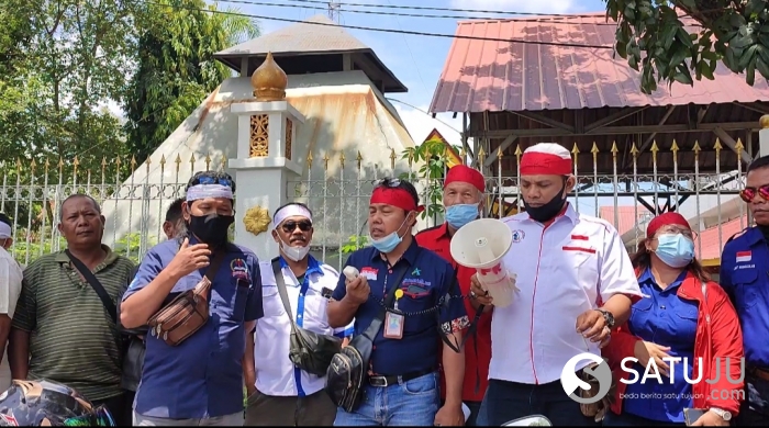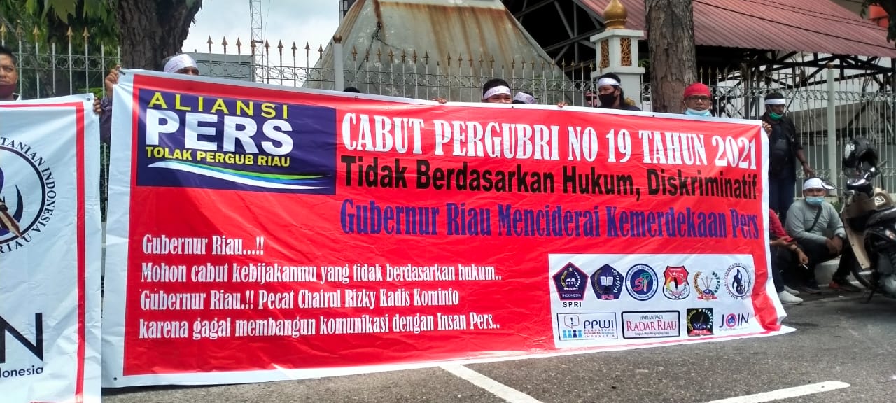 Pekanbaru, Satuju.com - Aliansi Pers Pergerakan Tolak Peraturan Gubernur Riau Nomor 19 Tahun 2021, unjuk rasa ke kantor Gubernur Riau, Drs Syamsuar, M.Si. Kamis, 21/10/2021.
