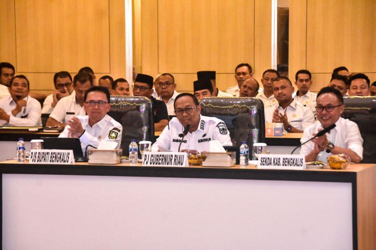 Penjabat Gubernur Riau (Pj Gubri), Rahman Hadi didampingi Penjabat Sementara (Pjs) Bupati Bengkalis, Akhmad Sudirman Tavipiyono dan Sekda Bengkalis dr Ersan Saputra memimpin langsung Rakor tersebut.