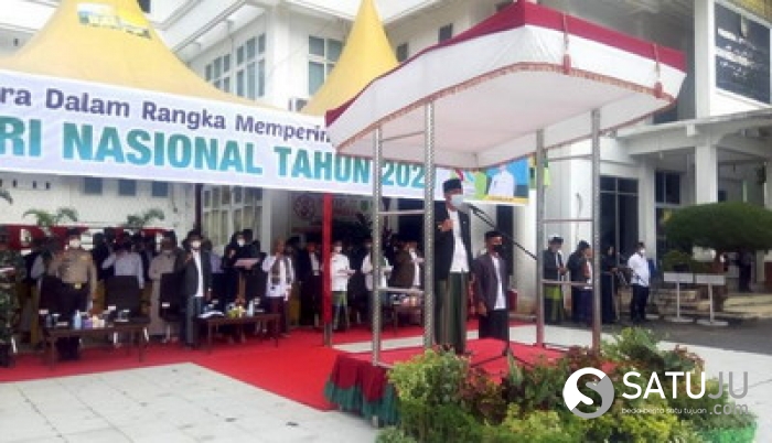 ROKAN HILIR, Satuju.com - Upacara memperingati hari santri nasional tahun 2021 di laksanakan di depan kantor BPKAD Rohil Jalan Merdeka Bagansiapiapi, Jumat (22/10/2021). Bupati Rokan Hilir Afrizal Sintong, S.IP selaku pembina upacara pada apel penaikan bendera merah putih pada hari santri tersebut menggunakan stelan sarung dan jas dengan dalaman baju teluk belanga putih. Tampak hadir wabup H.Sulaiman, SS, MH, Forkopimda, ketua dan wakil ketua TP PKK Rohil, para ulama, pimpinan tinggi pratama OPD Rohil dan para santri dan santriwati.
