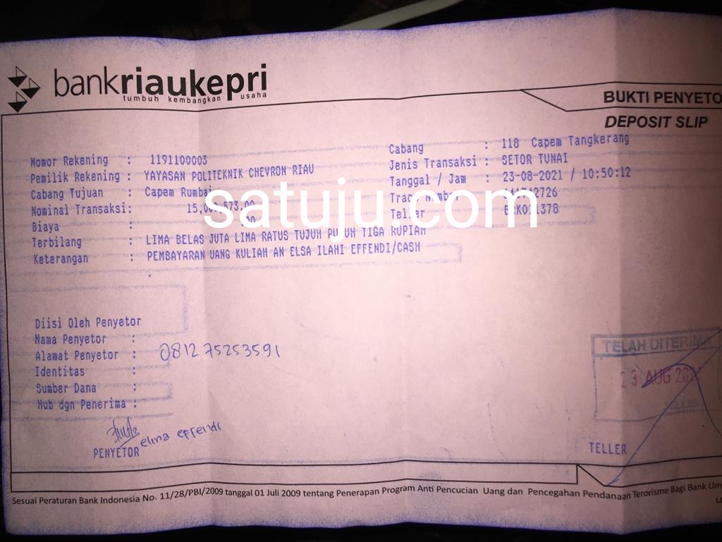 Uang sebesar 15 juta itu telah di Transfer ke Rekening Yayasan Politeknik Caltex Riau, yang berada di Umban Sari, Rumbai.
