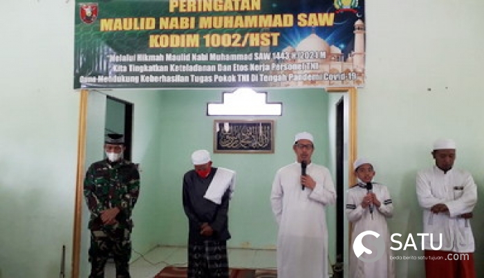 KAB. HULU SUNGAI TENGAH, KALSEL, satuju.com - Kodim 1002/HST menggelar kegiatan peringatan Maulid Nabi Muhammad SAW 1442 H/2021 M. Peringatan berlangsung dengan tetap menerapkan disiplin protokol kesehatan guna mencegah penyebaran Virus Corona. Kegiatan tersebut dilaksanakan di Langgar Nur Taqwa Komplek Beringin Jalan SMP Kelurahan Barabai Darat Kecamatan Barabai Kab. Hulu Sungai Tengah (HST). Senin 25/10/2021)
