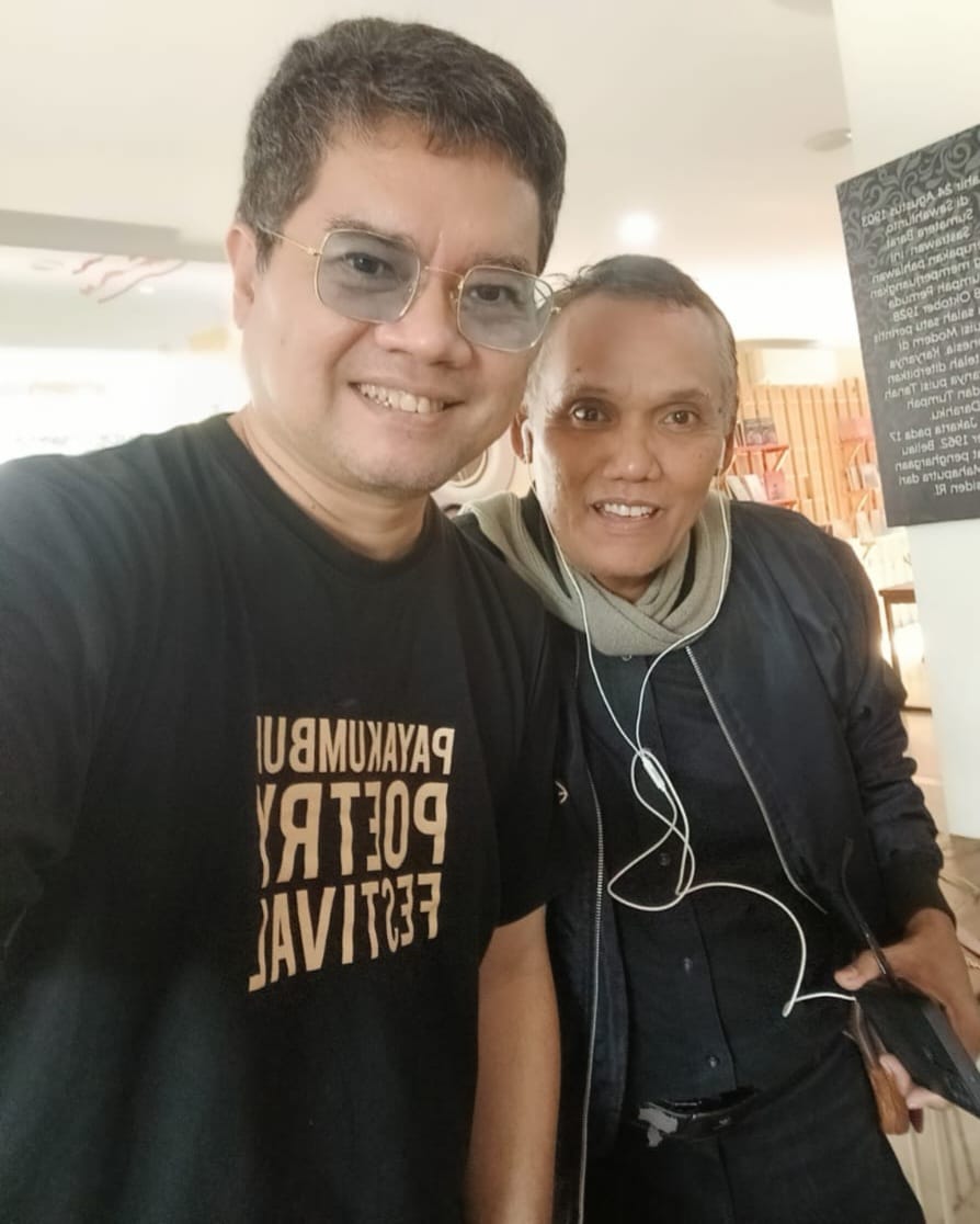 Komponis dan Musisi Ananda Sukarlan foto bersama dengan Penyair Pulo.Lasman Simanjuntak di Cafe Sastra Balai Pustaka Jln.Bunga Matraman Jakarta Timur, Minggu sore, 17 November 2024. (Foto : Ananda Sukarlan)