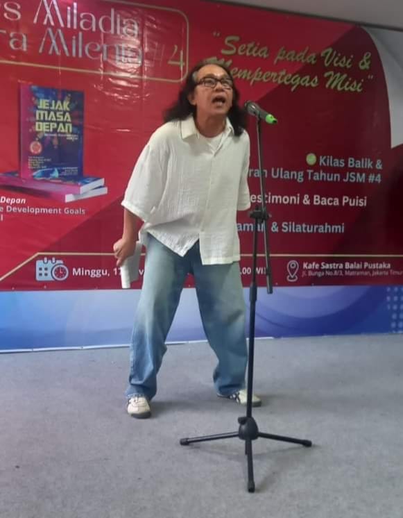 JAKARTA, Satuju.com - Penyair Pulo Lasman Simanjuntak ikut tampil dalam parade baca puisi menyambut tahun ulang (ultah) komunitas sastra Jagat Sastra Milenia (JSM) ke-4 bertemakan "Setia Pada Visi dan Memperkaya Misi" bertempat di Cafe Sastra Balai Pustaka Jln. Bunga , Matraman, Jakarta Timur, Minggu sore (17/11/2024).