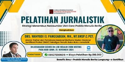 Drs. Wahyudi El Panggabean, M.H.,MT.BNSP., C.PCT yang juga Direktur Utama Lembaga Pendidikan Wartawan, Pekanbaru Journalist Center (PJC) dengan pengalaman 40 tahun jadi Wartawan.