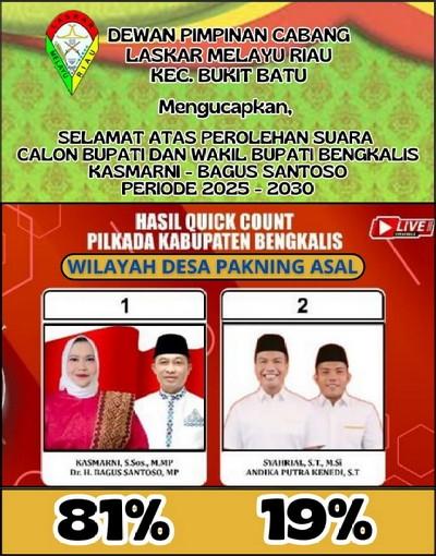 Ini adalah kemenangan bersama untuk masyarakat Desa Pakning Asal, karena masyarakat sudah tahu pemimpin yang benar - benar mampu memajukan daerah ini, yaitu Ibu Kasmarni dan Bapak Bagus Santoso. Angka kemenangan 81 Persen bukan hal yang mudah, apalagi dengan jumlah penduduk Desa Pakning Asal. yang terbilang besar. LMR Bukit Batu yang juga berbasis di Desa Pakning Asal mengucapkan tahniah kepada Bupati dan Wakil Bupati Bengkalis Terpilih Ibu Kasmarni dan Bapak Bagus Santoso, semoga Kabupaten Bengkalis semakin Bermasa 5 tahun ke depan,” ujar Erwin, Kamis (28/11/2024)