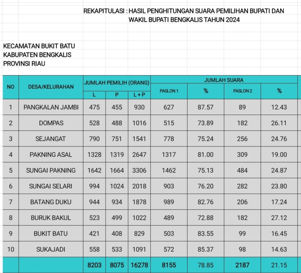 Berikut Tabel Perolehan Suara Hasil Quick Count Pilkada Bengkalis 2024 di Kecamatan Bukit Batu :