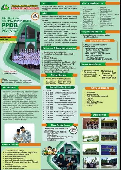Bengkalis, Satuju.com - Memasuki ajaran baru 2025-2026, Pondok Pesantren Madani Bengkalis membuka pendaftaran peserta didik baru untuk tingkat MTS/Wustho, tingkat MA/Ulya dan Takhassus Quran.