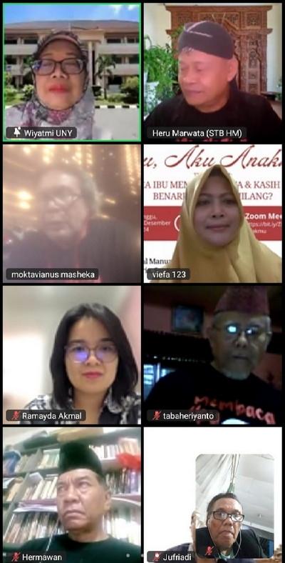Dalam pertemuan melalui.layar zoom ini hadir nara sumber Ramadya Akmal dengan makalah berjudul "Ibu Kerja Emosional dan Kerja Bayangan" serta Wiyatmi dengan makalah berjudul " Hari Pergerakan Perempuan Indonesia " dengan moderator Heru Marwata dan MC Viefa .