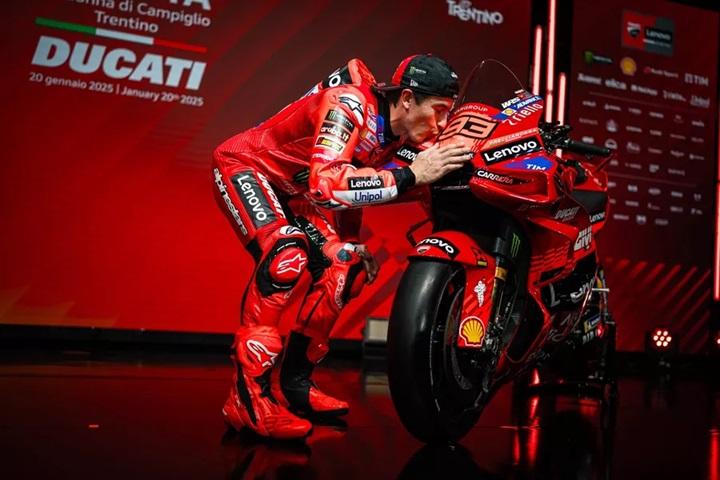 Marquez mengenakan logo Monster di topi dan baju balapnya pada presentasi tim Ducati. 'Cakar' juga ada di motornya. Faktanya, Monster semakin terlihat pada tahun ini, terutama pada Desmosedici GP25.