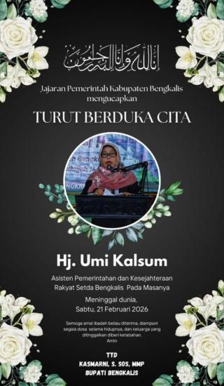 Bengkalis, Satuju.com - Kabar duka menyelimuti Kabupaten Bengkalis. Hj. Umi Kalsum binti H. Hasan, -