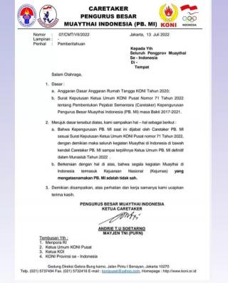KONI Pusat : "Segala Kegiatan Muanthai Indonesia Termasuk Kejuaran Nasional (Kejurnas) yang Mengatas